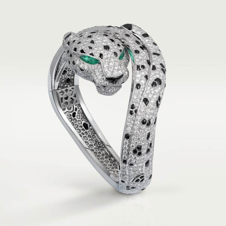 PANTHÈRE DE CARTIER bracelet - 950‰ platinum, set with 2 emerald panther eyes, 146 onyx leopard spots, 1 onyx leopard nose, 1,132 round brilliant-cut diamonds totaling 16.05 carats.